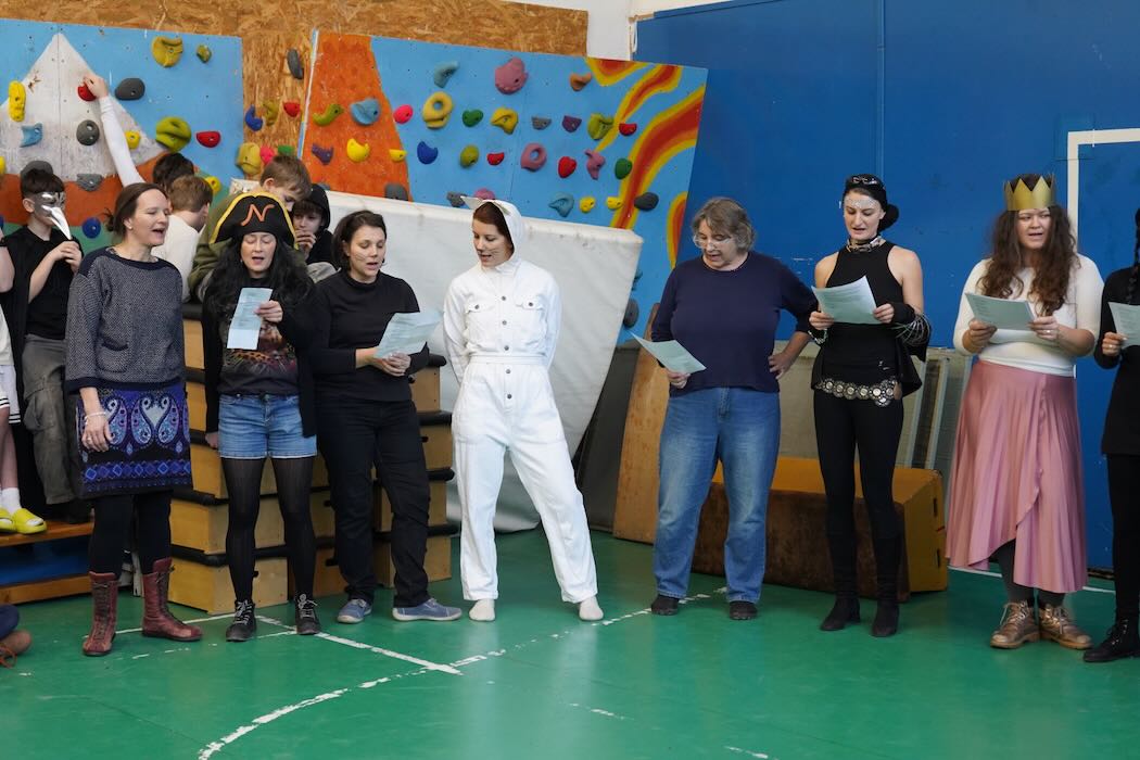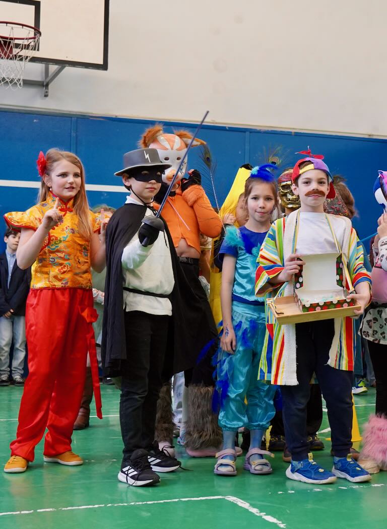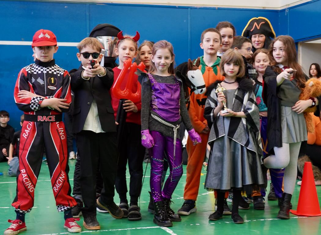 Az udvari program után következett a jelmezes felvonulás. Mesefigurák, sportolók, állatok és különféle kreatív ötletek lepték el a tornatermet – gyerekek és felnőttek egyaránt örömmel bújtak jelmezbe. A felvonulást idén is a tanárok vidám előadása követte. A színpad egyik oldalán a pedagógusok beszélgettek békésen, amikor hirtelen megjelent egy gonosz boszorkány fekete macskájával. Nem tetszett neki a rend és a nyugalom, ezért varázsigével „átváltoztatta” a tanárokat – akik ettől kezdve egészen furcsa dolgokat kezdtek el énekelni a jól ismert dallamra:.