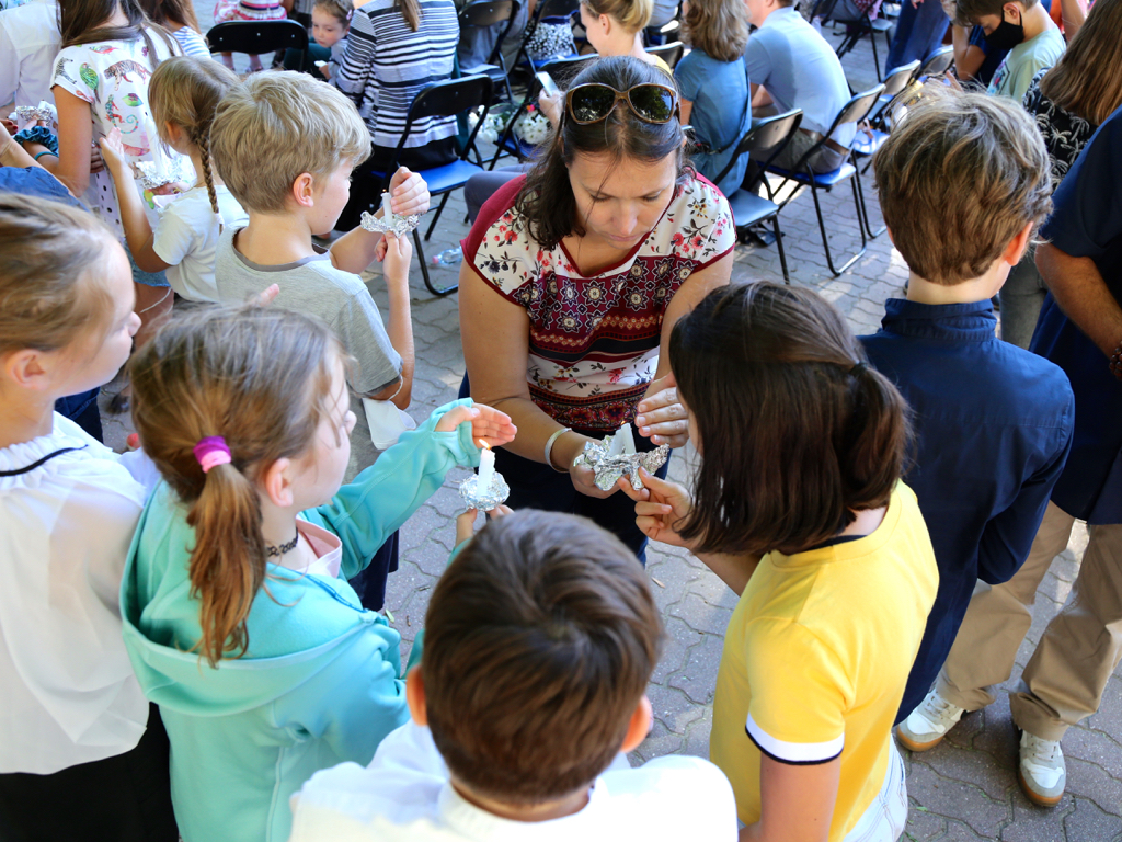 Az évnyitó egyik legfontosabb és számunkra legszebb pillanata következett: a gyertyagyújtás és a tudás lángjának az átadása. A nagy gyertyáról a pedagógusok meggyújtották a gyerekek kis gyertyáit. Ezután Era mindenkinek egy szép tanévet kívánt, amit remélhetőleg személyesen tudunk majd együtt megélni. Ezzel vágtunk bele a következő nagy kalandba a Rogers Iskola 31. tanévébe.