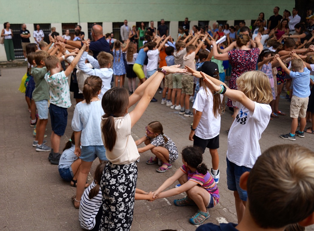 A szeptemberi napsütésben megtartottuk évnyitónkat az iskola udvarán. Az ünnepség a hagyományaink szerint zajlott: a kis ovisok és elsősök átbújtak a nagyobb gyerekek és tanárok karjaiból épített kapukon, majd helyet foglaltak az első sorban. A közös tábordal után Lipták Era, a Rogers Iskola és Óvoda igazgatónője örömmel köszöntötte az újakat és szüleiket, valamint bemutatta az új kollégákat. Az új ovisokat és az elsős Dallam osztályt nagy tapssal üdvözöltük.