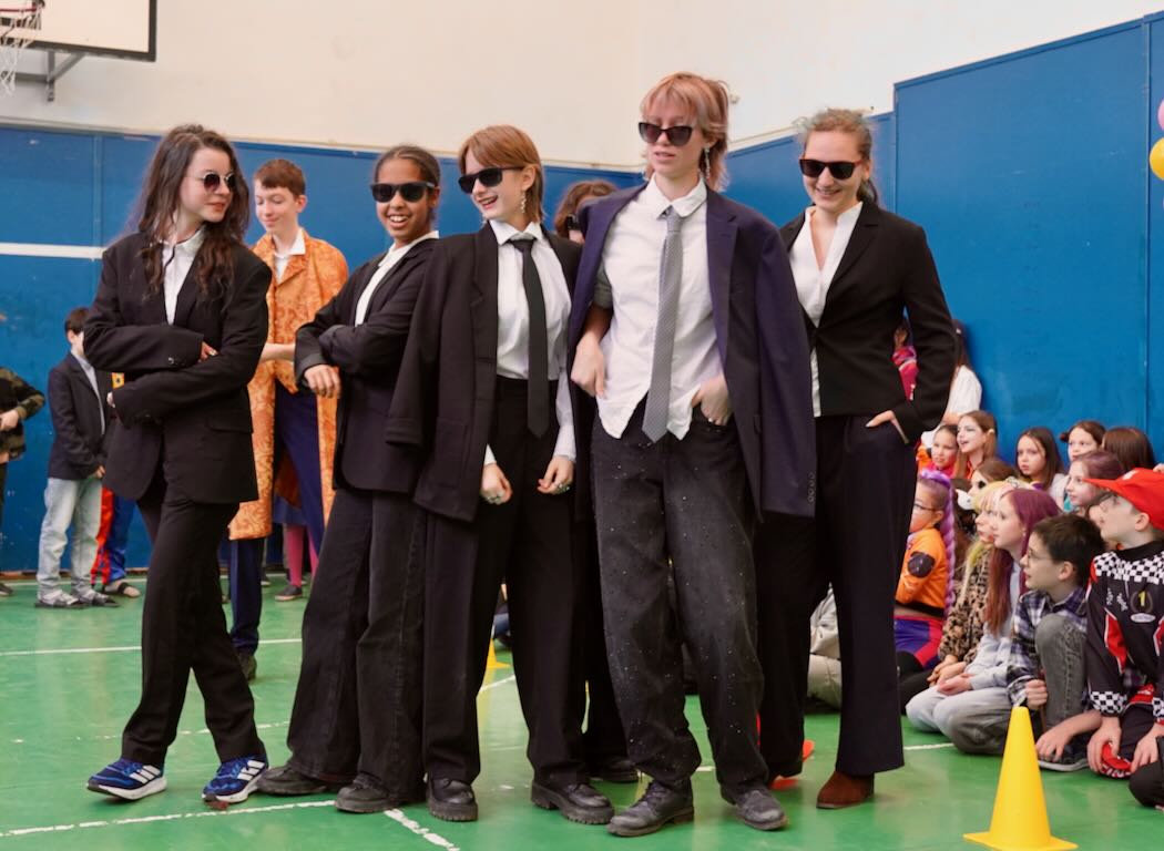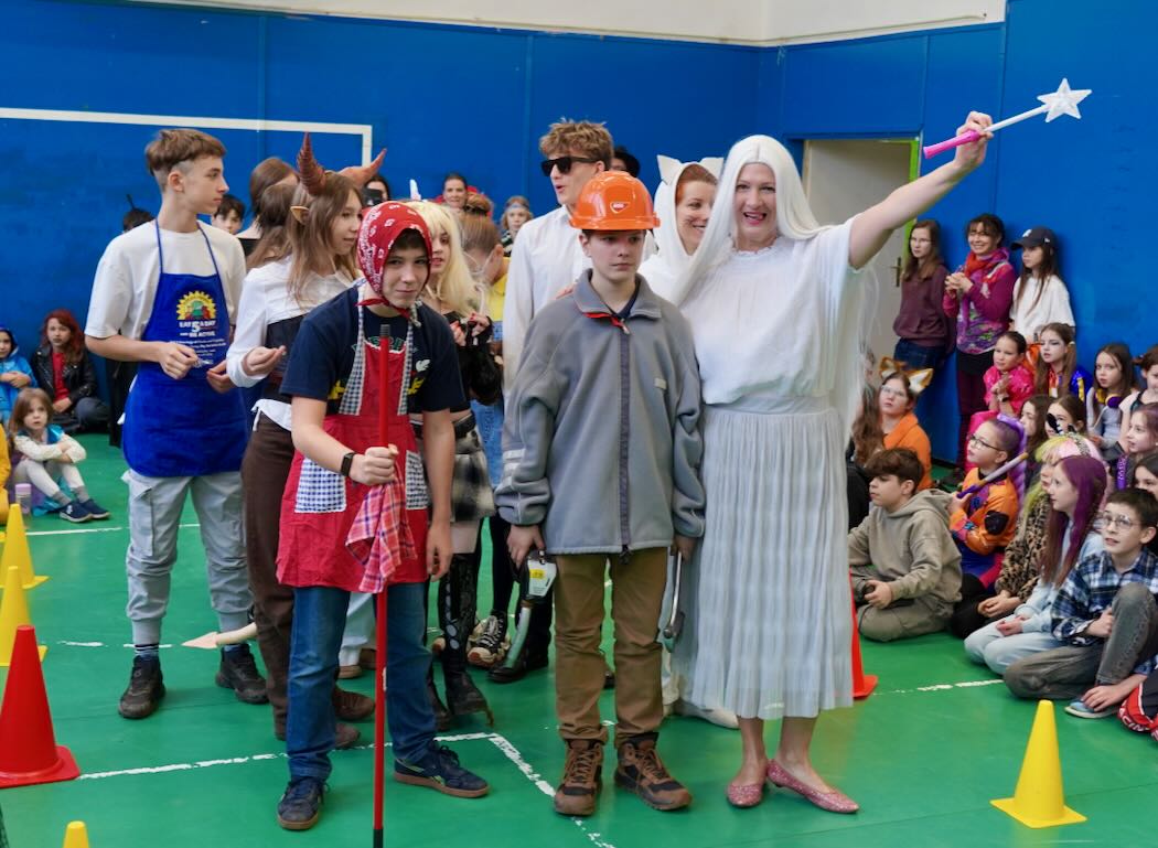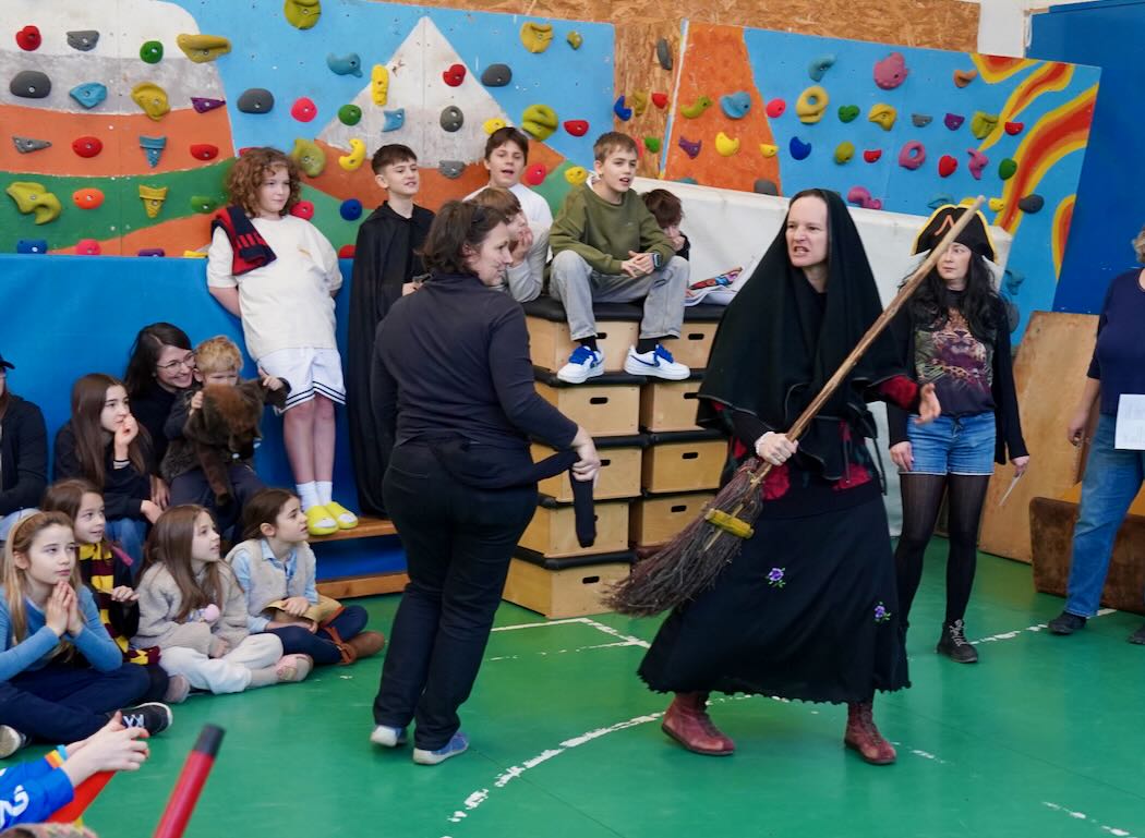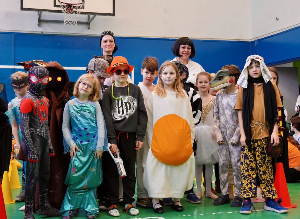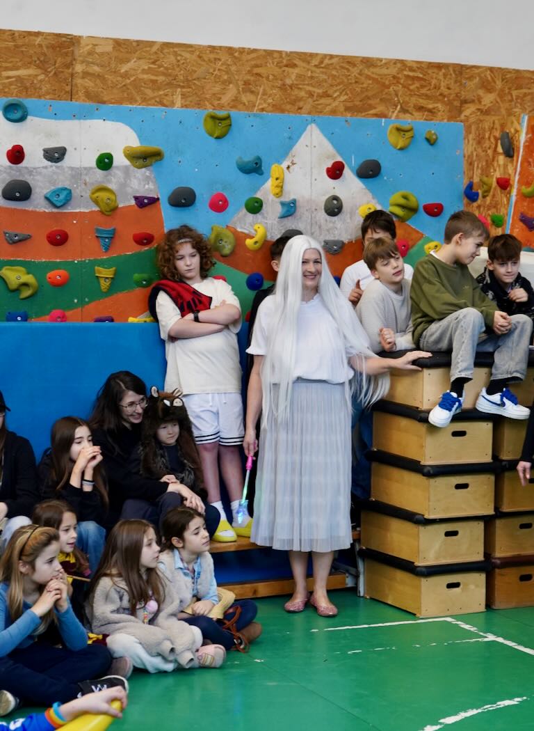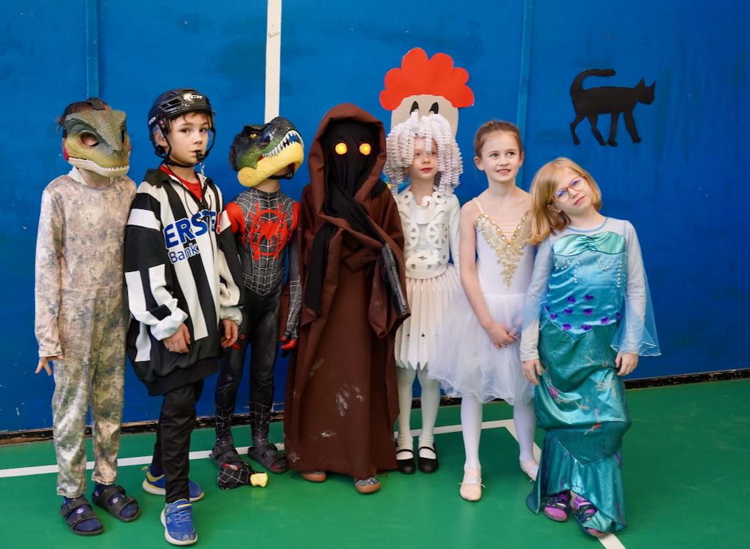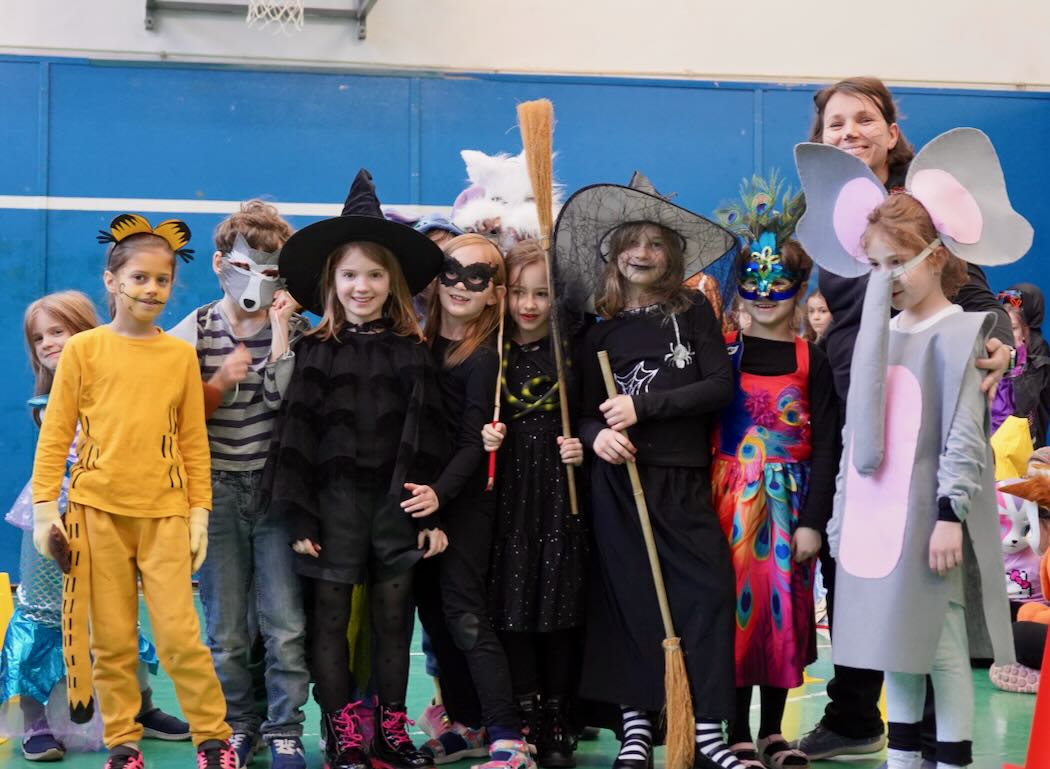 Az udvari program után következett a jelmezes felvonulás. Mesefigurák, sportolók, állatok és különféle kreatív ötletek lepték el a tornatermet – gyerekek és felnőttek egyaránt örömmel bújtak jelmezbe. A felvonulást idén is a tanárok vidám előadása követte. A színpad egyik oldalán a pedagógusok beszélgettek békésen, amikor hirtelen megjelent egy gonosz boszorkány fekete macskájával. Nem tetszett neki a rend és a nyugalom, ezért varázsigével „átváltoztatta” a tanárokat – akik ettől kezdve egészen furcsa dolgokat kezdtek el énekelni a jól ismert dallamra:.