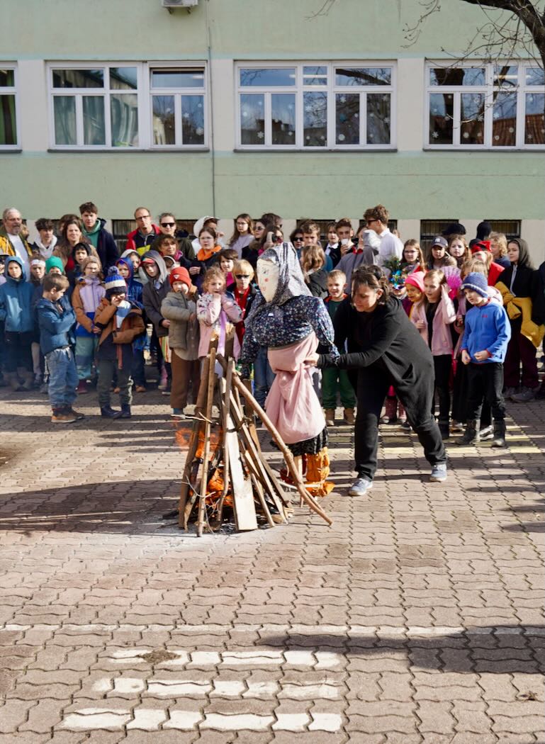 A napot az udvaron folytattuk, ahol elégettük a kiszebábot, hogy jelképesen is elköszönjünk a téltől. Télűző rigmusokat kiabáltunk – „Vesszen a tél, jöjjön a tavasz!” –, hogy biztosan meghallja mindenki: ideje váltani az évszakot.